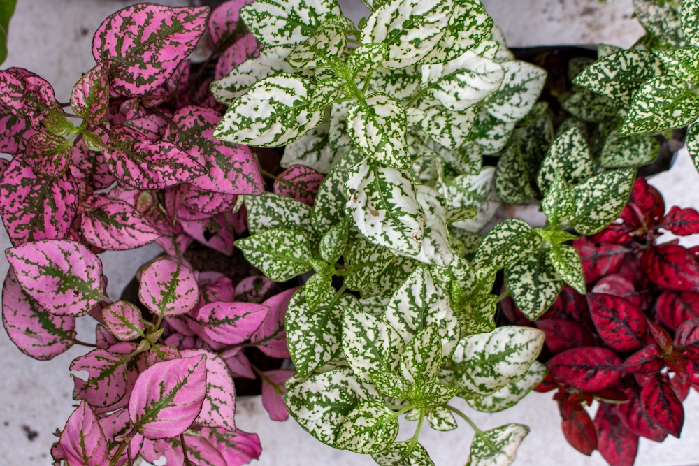 - ‘Confetti Mix’: The best of all worlds, this mix of polka dot plants is easy to find and contains plants with pink, white, and red coloration.